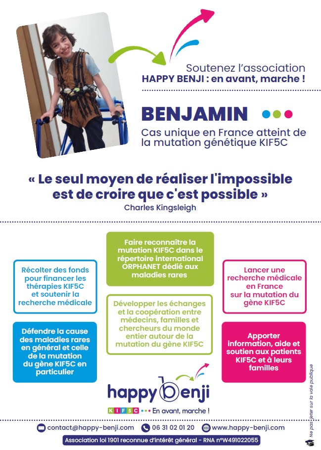 Diagnostiqué à l’âge de 3 ans ½, Benjamin est l’unique cas en France d’une maladie génétique rare, due à la mutation du gène KIF5C. Notre association caritative à but non lucratif porte le projet d’emmener Benjamin dans une clinique en Louisiane, où il pourra bénéficier de soins spécifiques, basés sur une approche neuromodulable et l’intégration des réflexes sensorimoteurs.