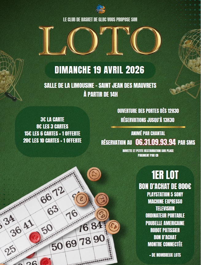 Retenez la date du 19 avril pour le loto du club GLBC49 : un après-midi à partager en famille, entre amis avec de très beaux lots à gagner !