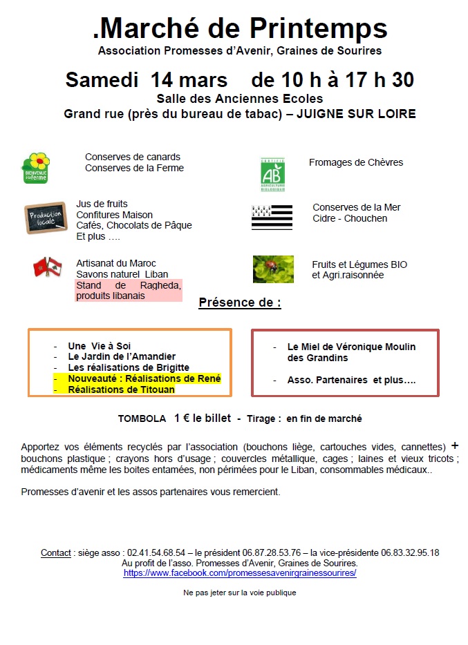 L’Association Promesses d’Avenir, Graines de Sourires vous convie à découvrir ou redécouvrir son marché de printemps qui aura lieu le samedi 14 mars 2026 de 10 heures à 17 h 30 salle des anciennes écoles (légumes et fruits de saison, fromages chèvres, conserves de canard et de la ferme, produits de la mer, cidre, confitures, cafés, chocolat, miel, produits libanais, réalisations de partenaires divers, herbes aromatiques et dérivés, produits d’artisanat…..)