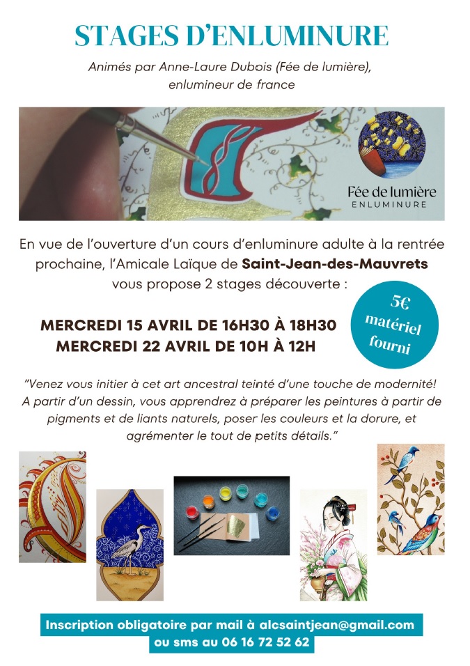 En vue de l’ouverture d’un cours d’enluminure adulte à la rentrée prochaine, l’Amicale Laïque vous propose 2 stages découverte :