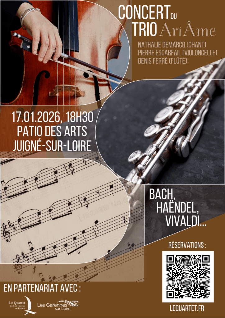 Le samedi 17 janvier 2026, à 18h30, le trio AriÂme (flûte traversière, violoncelle et chant) tiendra au Patio des Arts de Juigné-sur-Loire (Les Garennes-sur-Loire) un concert autour d’un répertoire baroque profane et sacré.